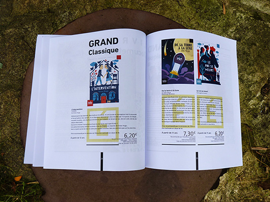 Catalogue livres jeunesses. Mise en page d'un catalogue, mettre en avant le travaille d'auteur et d'illustrateur. Un travail d'humilité qui demande de s'effacer, de réfréner ses propres tiques graphiques pour ne pas trop personnaliser l'objet final.