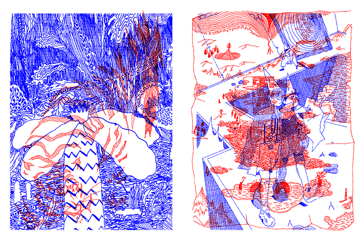 Le principe est très simple. Deux illustrations sont superposées une sur l’autre. L’une est bleue l’autre est rouge. L’une sur l’autre. À l'aide d’un petit dispositif de calque chaque illustration prend son indépendance en fonction de là où l’on regarde. On crée ainsi un sens nouveau qui se rapproche du langage séquentiel de la bd.